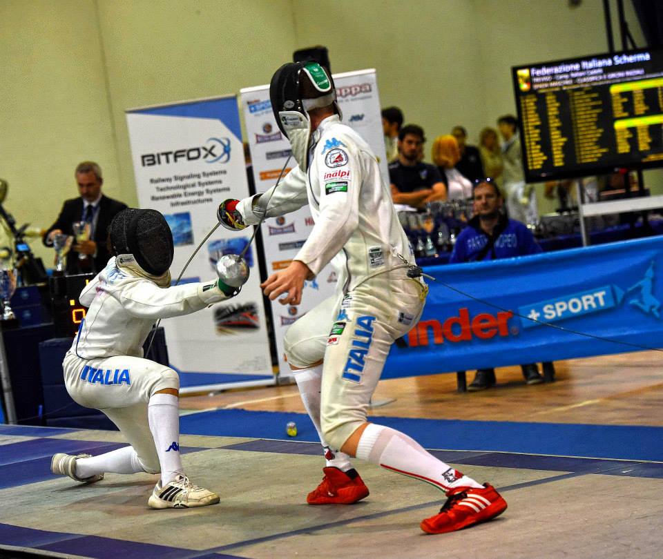 Federico Marenco è secondo dopo i gironi solo a Valerio Cuomo, unici con tutte vittorie, e purtroppo la supremazia tra i due verrà decisa solamente con la stoccata del 15-14, dopo che il nostro Panzer era stato in vantaggio per 14-13. nel mezzo eliminava in sequenza Matteo Pontieri (Verona Scherma) 15-12, Riccardo Abate (ISEF Torino) 15-11, Amedeo Zancanella in uno scontro per noi crudele 15-13 e Gianpaolo Buzzacchino 15-11. Nella stessa gara Amedeo Zancanella terminava la sua gara all’8° posto ed è un vero peccato che i due si siano dovuti